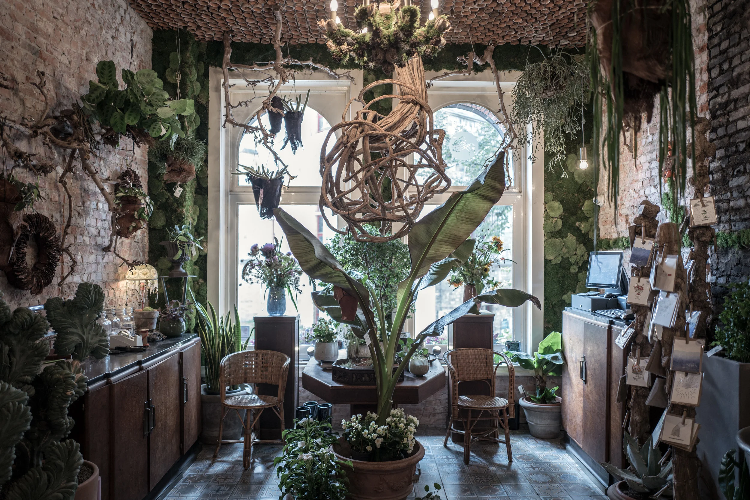 Stepping inside we found its labyrinthine interior filled with exotic plants. The jungle-like atmosphere was enhanced by hanging woven floral sculptures, tufted moss installations that snaked up the open brickwork walls and the hundreds of tiny terracotta pots that lined the ceiling.