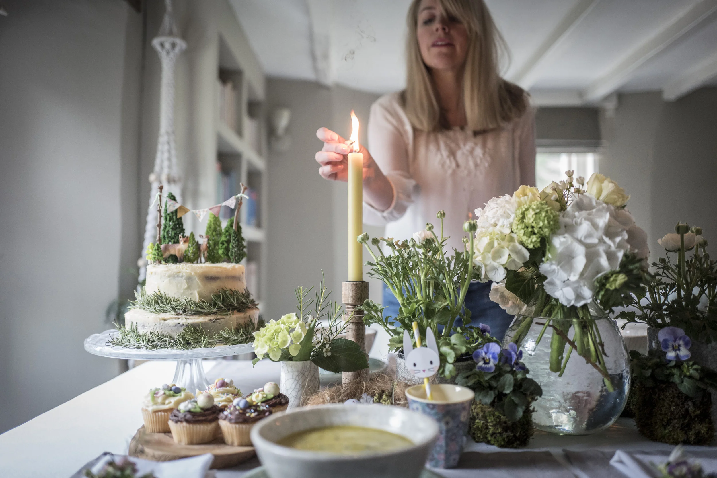 All celebrations call for a feast. And, although I’d made Easter-themed fairy cakes, decorated egg-shaped biscuits and a layer cake (more on that later), I wanted this to be a proper sit-down meal rather than afternoon tea. I found endless inspiration for the food I would serve in Eva Kosmas Flores’ brilliant new book, First We Eat. I pored over it for weeks. In fact, the majority of the dishes came from my experimenting with her inspirational seasonal recipes. It was difficult to narrow it down but I finally settled on bowls of fragrant green bean and lemon soup, roasted asparagus crostini with lemon cream cheese and fennel and pistachio pesto lasagne.