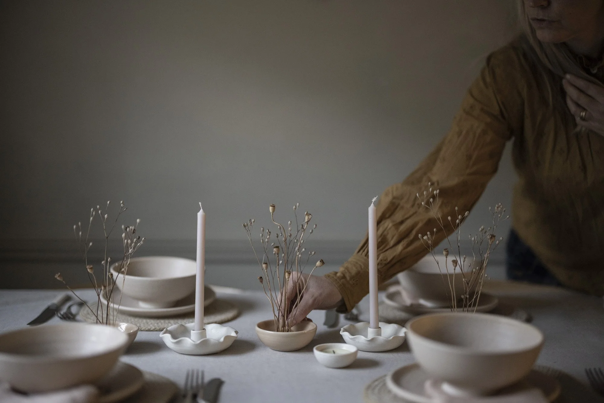 I like to use shorter stems fixed into these metal kenzans and sit them within these bowls to create a minimal table arrangement that’s big on impact (you can see an example in the opening photograph - and there are more below). For larger, fresh displays, I use our ceramic flower frogs, which I think look super neat inside our new oatmeal Harvest bowls.