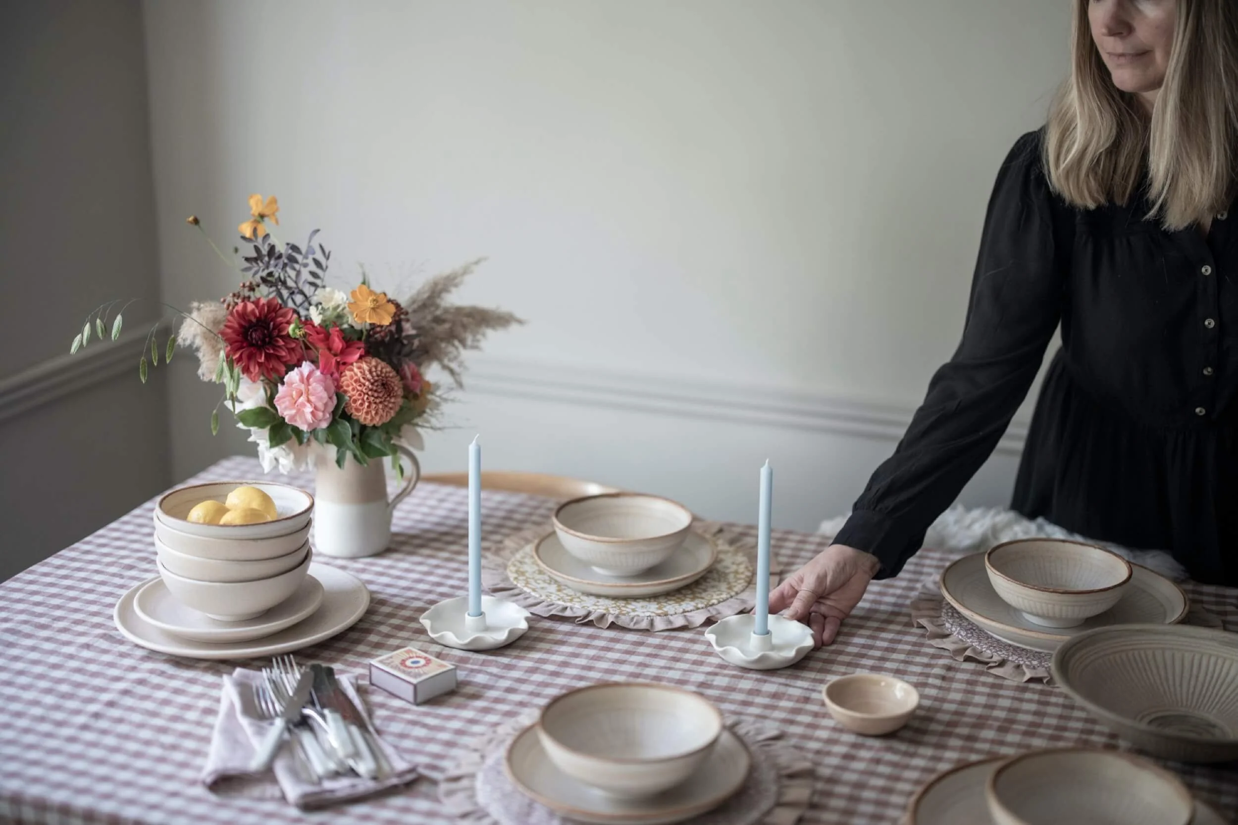 With the onset of winter comes a yearning for creating cocooning spaces and embracing the feeling of hunkering down with soft blankets beside an open fire. We’re naturally paying a bit more attention to our indoor surroundings, which often determine our mood. On the table, for me, it’s about embracing natural textures with flowers (dried and fresh) and my favourite ceramics, then adding the twinkle of fairy lights and flickering candles.