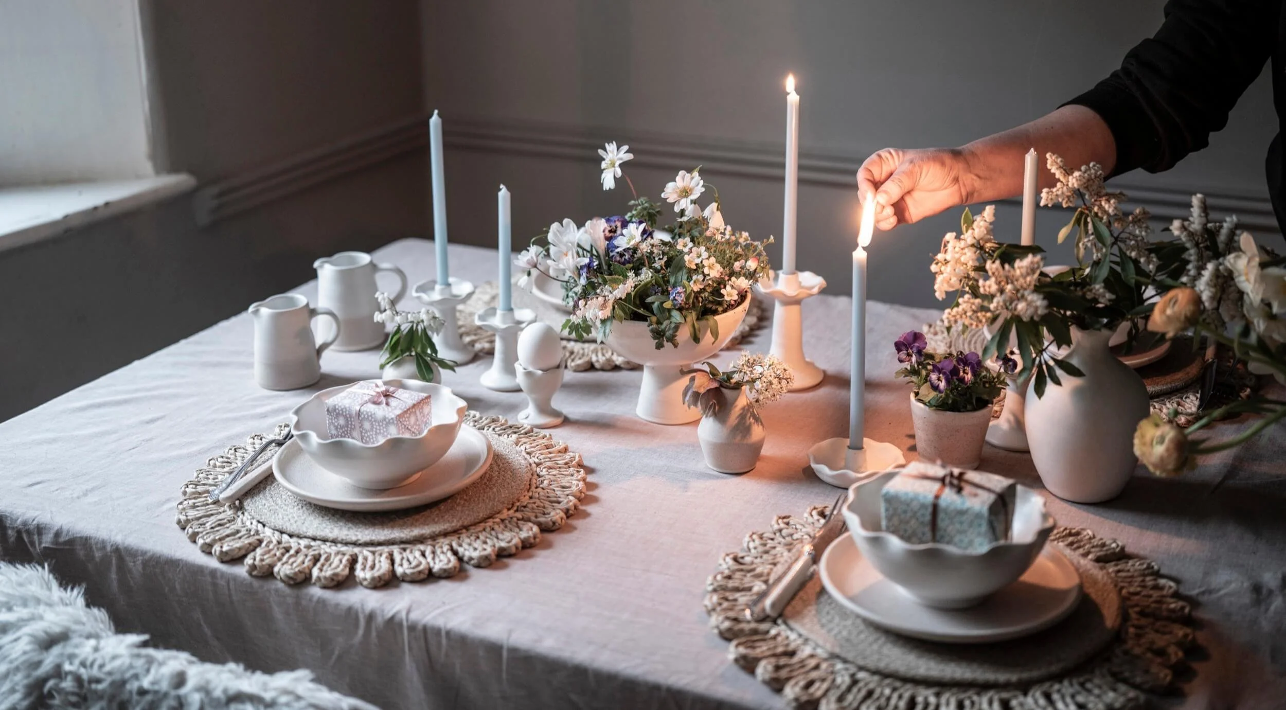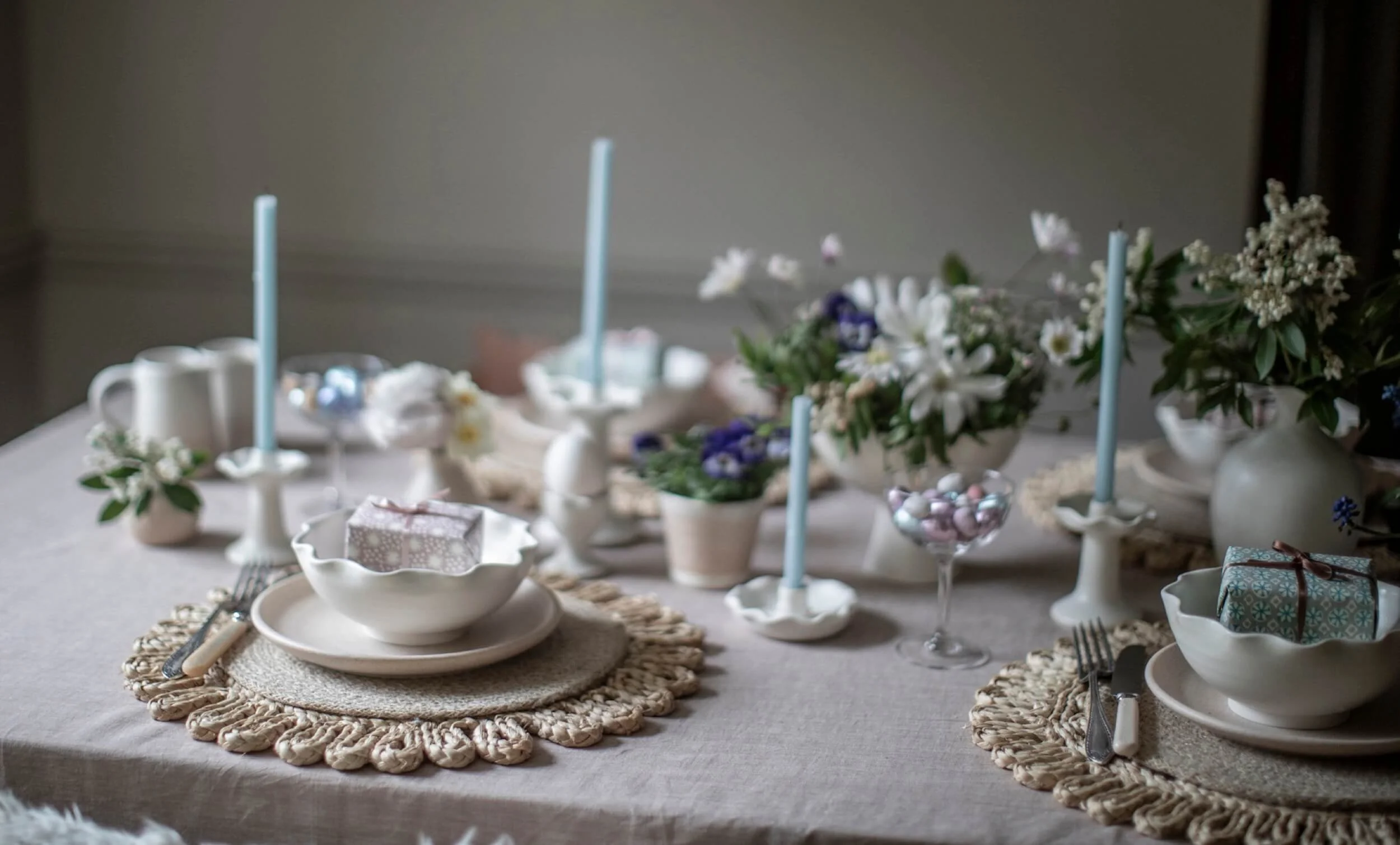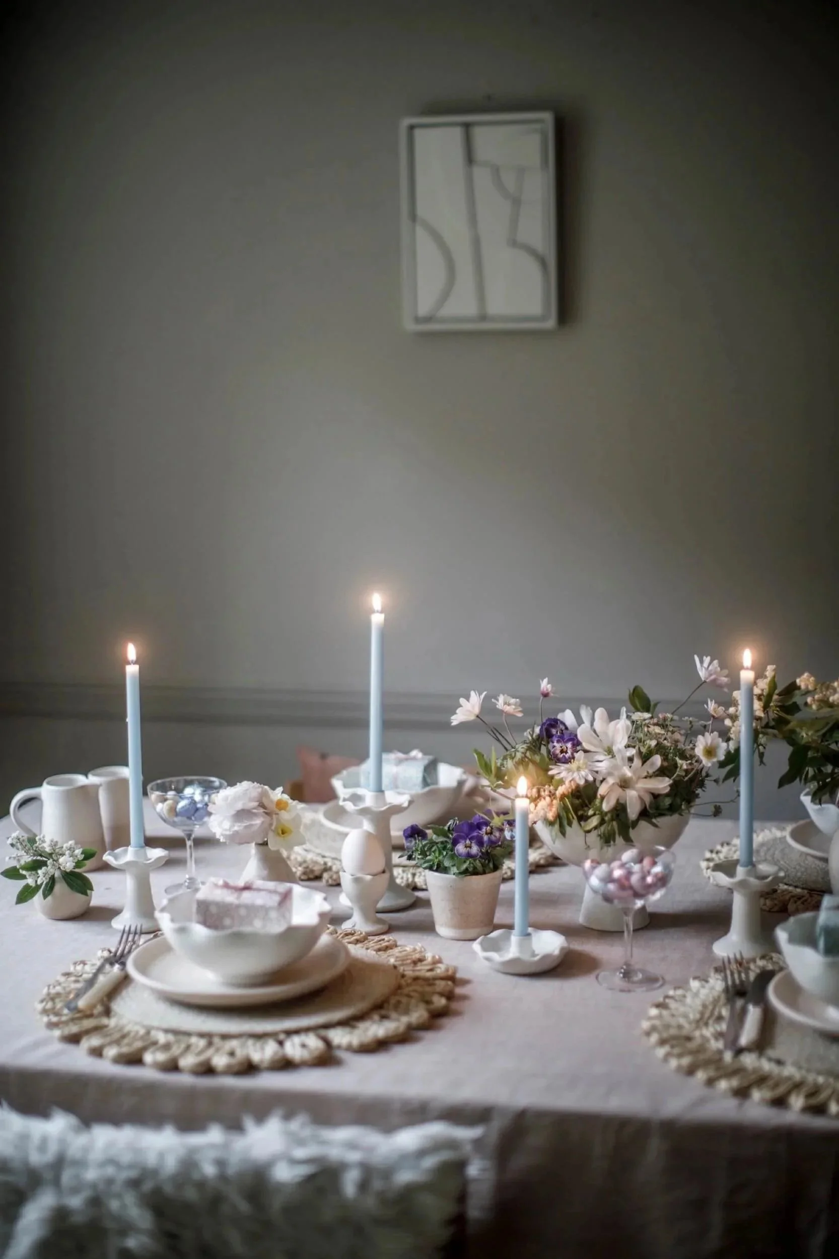 For this fairly informal setting, I’ve used a mix of our scalloped ceramics, soft blue candles, and simple spring flowers to keep everything feeling light and natural. The aim is to create a table with atmosphere, that feels welcoming, not overly styled.