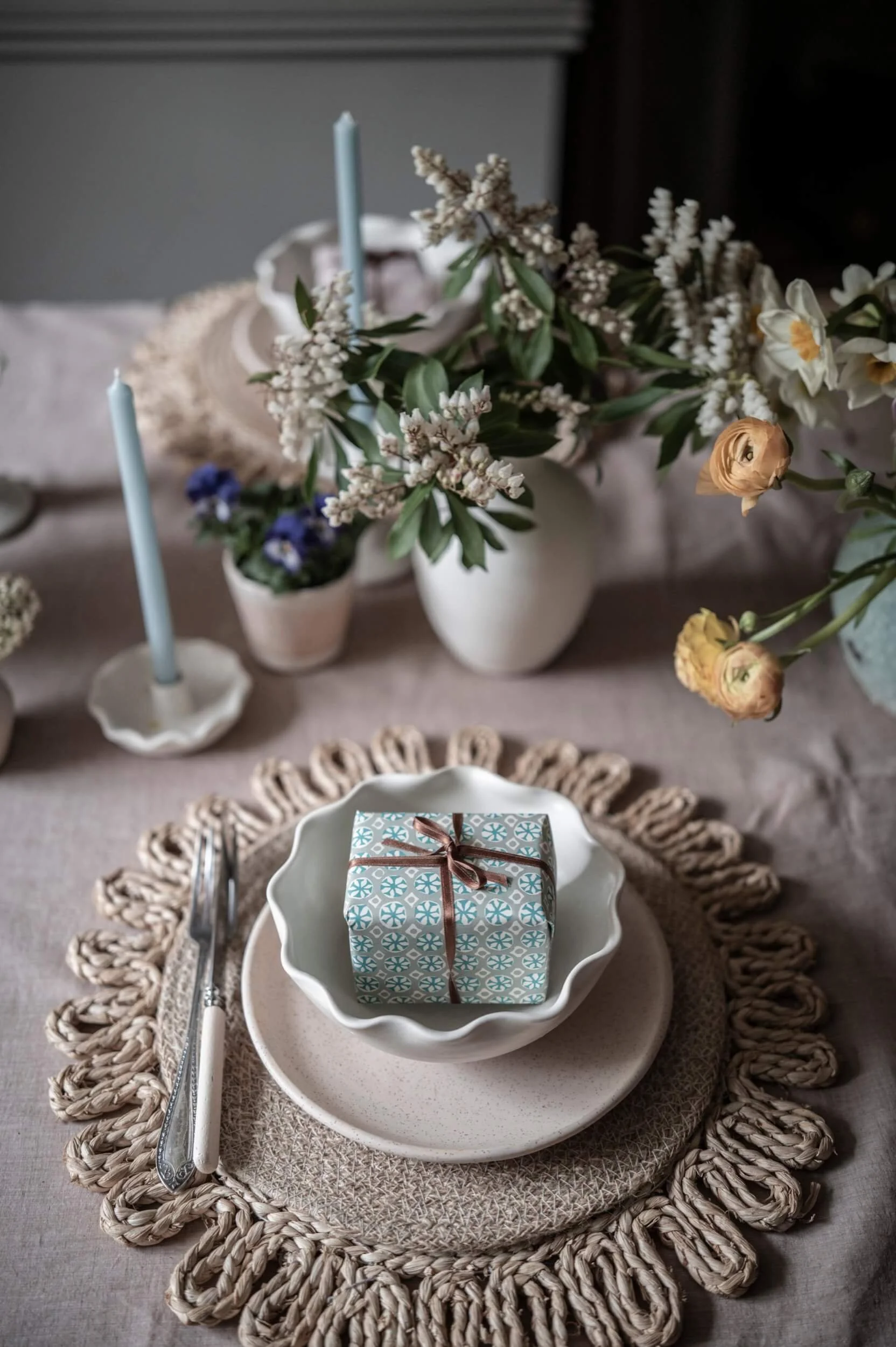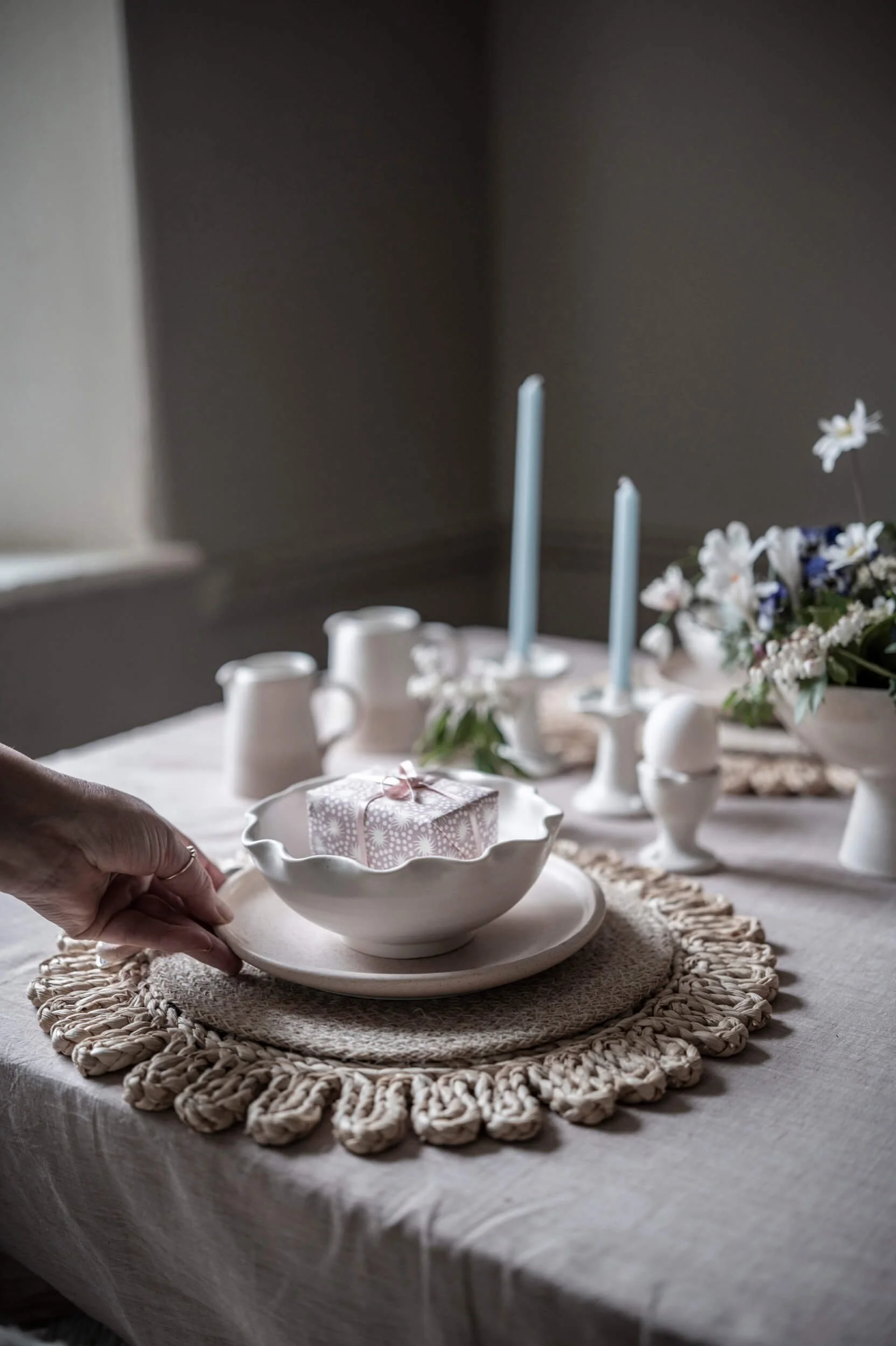 For each place setting, I’ve kept things simple - filling our fluted bowls with small individually wrapped gifts and and put egg cups. A small gesture, like placing something wrapped or a decorated egg at each setting, helps make the table feel thoughtful without needing much else..