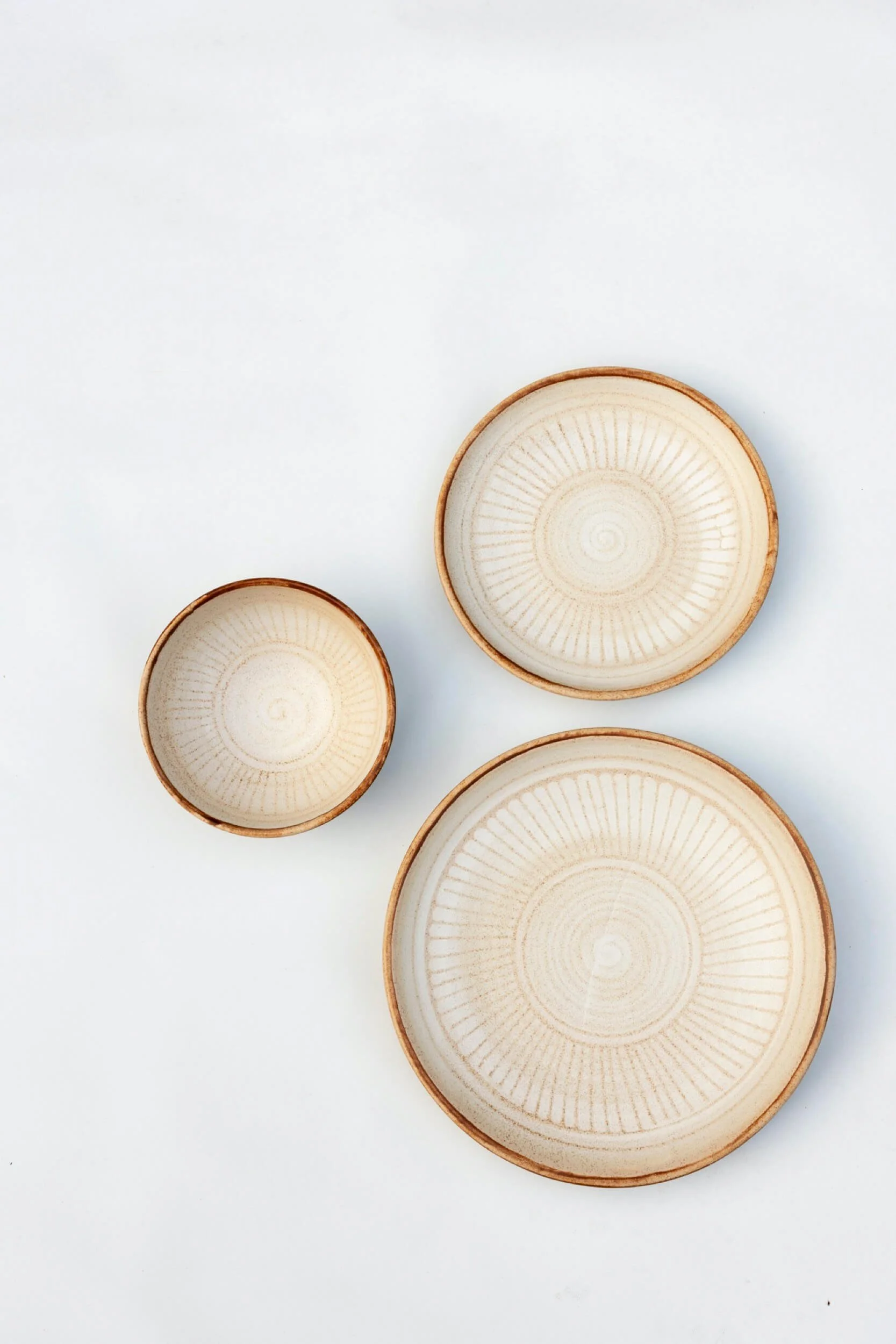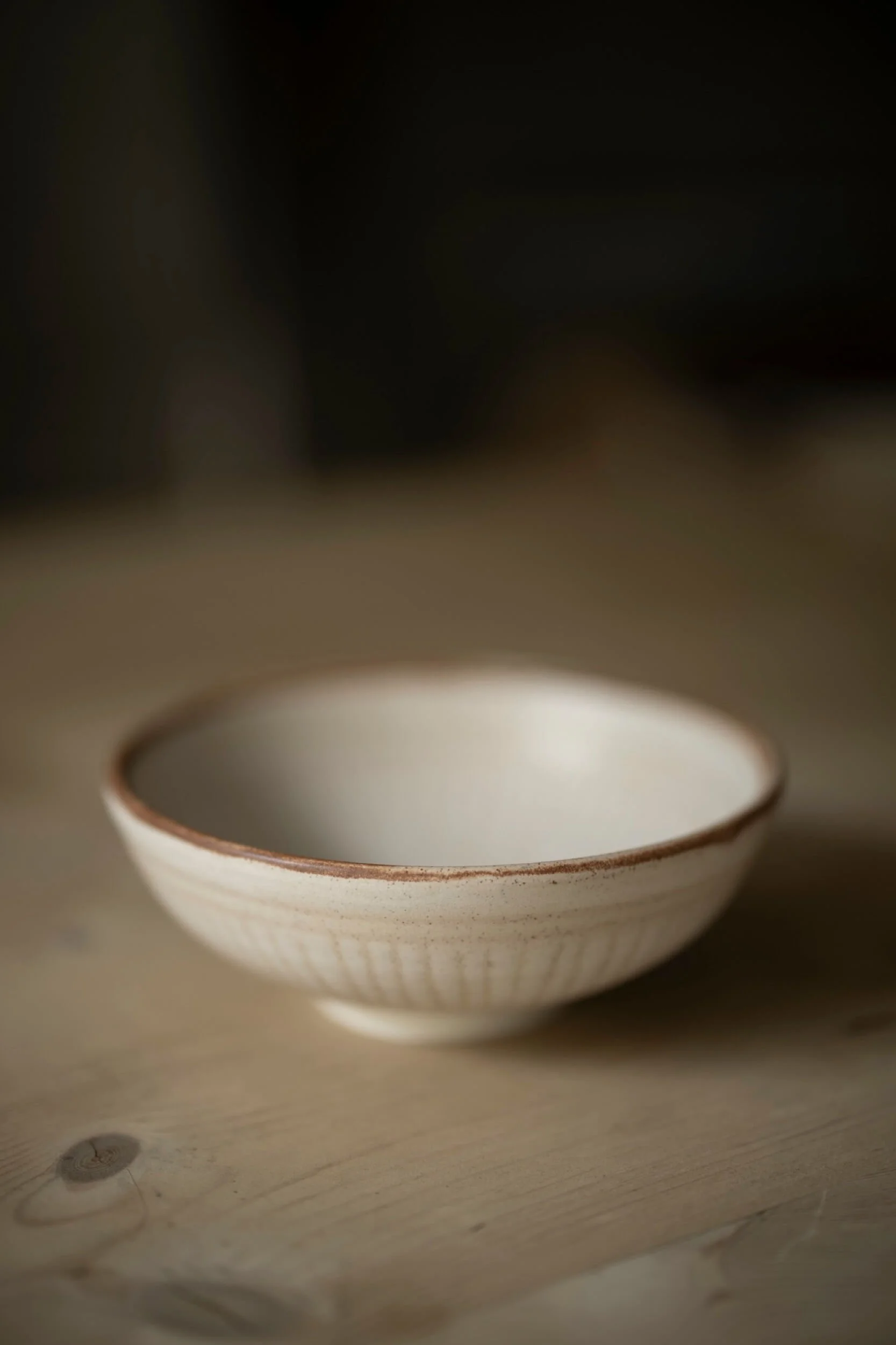 Designed for those who delight in the tactile nature of handmade pottery, this porcelain bowl goes through five different processes once it’s been thrown and turned. Before being fired, it’s dipped in oatmeal glaze. Once fired it’s then brushed with white glaze. When the glaze is dry, the linear pattern is incised on the interior and exterior before it’s fired one more time.